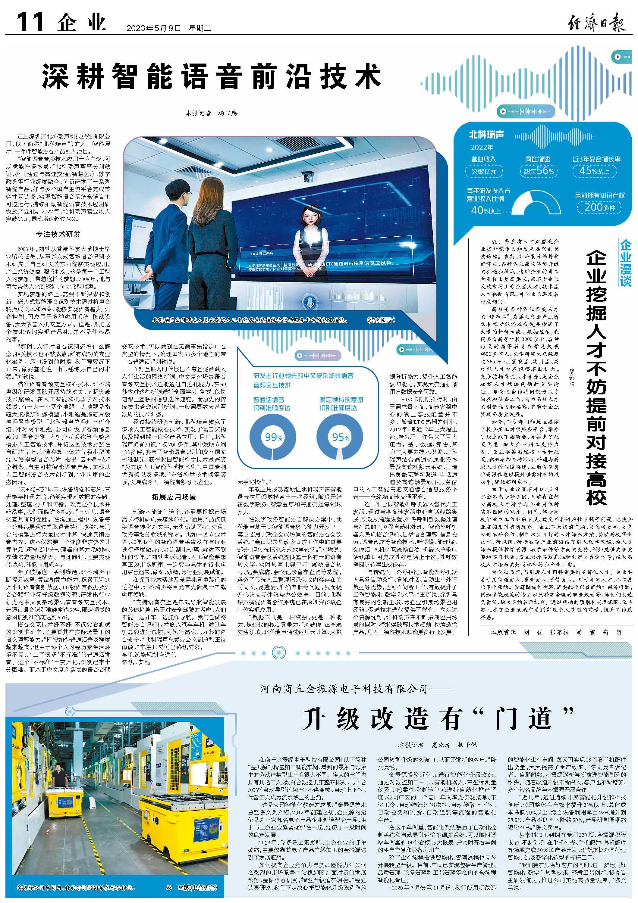 《经济日报》创刊于1983年,是国务院举办、中宣部领导和管理的、以经济报道为主的综合性中央级党报,是经济领域发行量大、权威性和公信力强的主流媒体。近日,《经济日报》赴深圳市北科瑞声科技股份有限公司进行专访。以下内容转载自《经济日报》: 走进深圳市北科瑞声科技股份有限公司(以下简称“北科瑞声”)的人工智能展厅,一件件智能语音产品引人注目。“智能语音音频技术应用十分广…