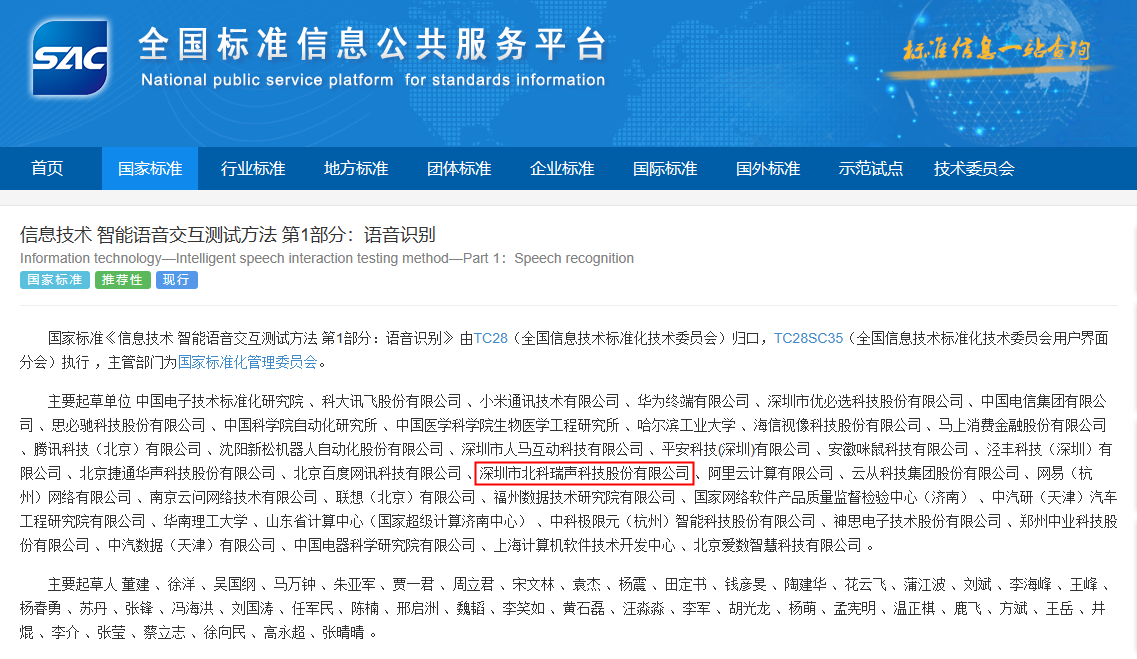2023年5月,由深圳市北科瑞声科技股份有限公司参编的两项国家标准--GB/T41813.1-2022《信息技术智能语音交互测试方法第1部分:语音识别》和GB/T41813.1-2022《信息技术智能语音交互测试方法第2部分:语义理解》正式实施。 2022年10月14日,国家市场监督管理总局(国家标准化管理委员会)发布《中华人民共和国国家标准公告(2022年第13号)》,批准GB/T41813…